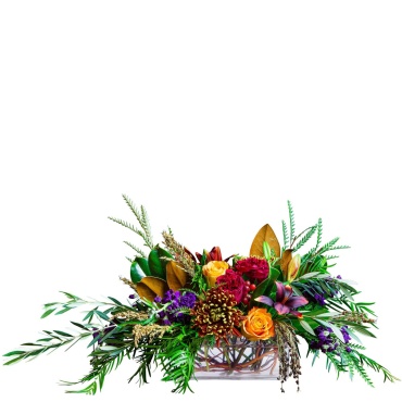 Amber waves of grain and striking olive branches extend a warm welcome to your friends and family in this gorgeous centerpiece. Orange roses, burgundy lilies and autumn magnolia leaves provide such a fabulous addition to your feast. <br> Approximately 30" W X 14" H