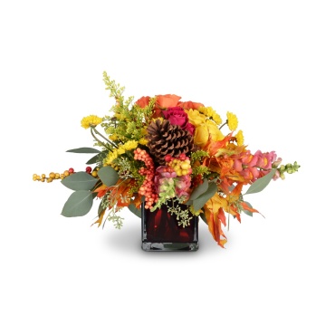 Let the sparks fly. Bonfire Bounty is sure to promote that warm comfortable feeling of a blazing fire. The ruby red cube has a mix of fall leaves, spray roses, and natural elements reminding you of nights by the fire.