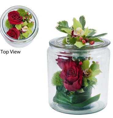 A clear glass terrarium designed with rich color, beautiful blooms both inside and out.
