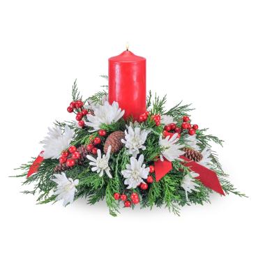 A beautiful combination of white blooms, berries, pinecones and evergreen surround a pillar candle in this traditional table centerpiece. White chrysanthemums and evergreen surround a pillar candle and are accented with red berries, pinecones and velvet ribbon.