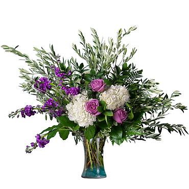 Lavender and white flowers like stock, roses, and hydrangea combined with greenery that almost dances creates a beautiful, organic style design created in a clear glass vase with turquoise crushed sea glass perfect for a kitchen island or entrance table.