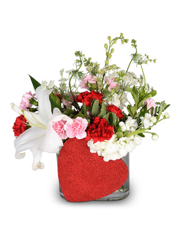 Your Love is delicate. Lily n' Lace is a mix of play and passion. A beautiful white lily is complemented by Queen Anne Lace and a glittery heart to bring a smile to your love. Approximately 13" W X 13" H