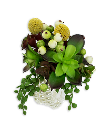 An organic mix of succulents, berries and blooms on a pearl bracelet for a unique wrist corsage.
