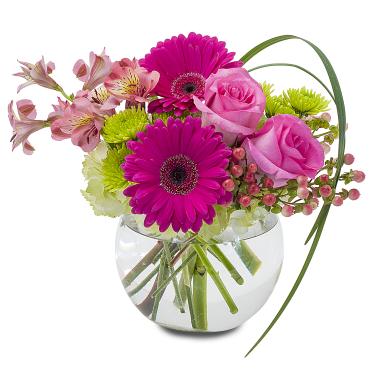 A bubble bowl filled with pink and green flowers with a creative touch of lily grass.Â