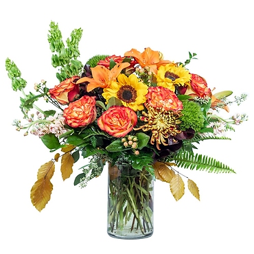 Share the beauty of open skies and rustic colors. Tulsa Nights is reminiscent of the midwest skies. Roses, lilies, and sunflowers in gorgeous oranges and yellows are a few of the stars of this arrangement <br> Approximately 19"W X 21"H