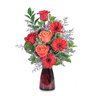 Scarlet gerbera daisies and orange roses join together in this rich red glass vase for a bold combination to brighten a day. A red glass vase filled with red gerbera and orange roses accented with limonium and premium foliage.