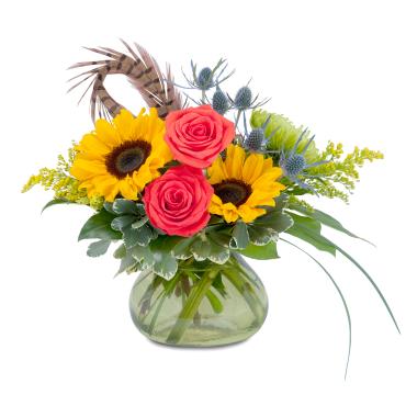 Bright but warm harvest colors of sunflowers, roses and accent flowers combine in this design to bring a bit of sunrise beauty.