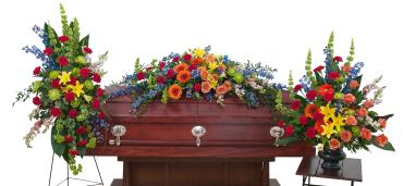 The treasured celebration trio includes a casket spray, standing easel spray and crescent urn arrangement.
